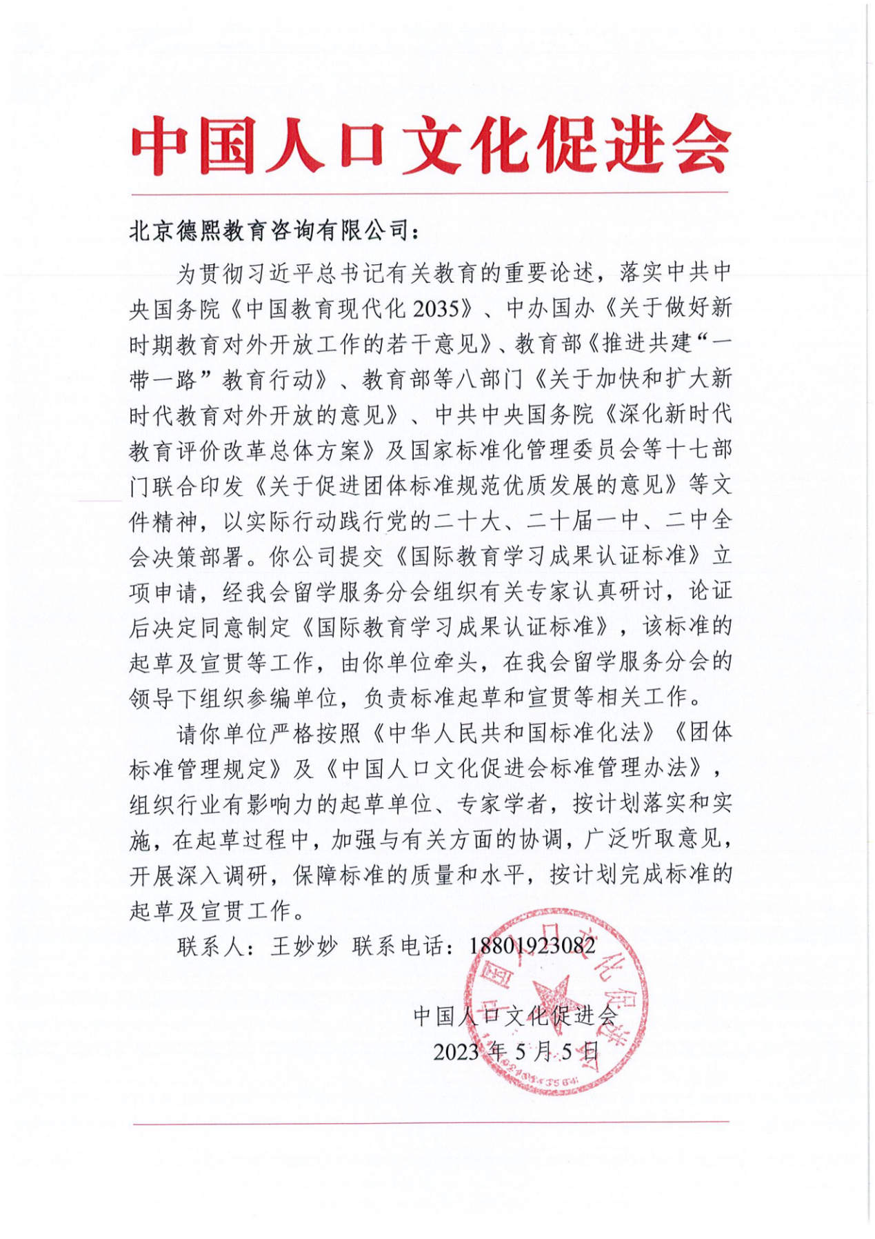 促进会同意《国际教育学习成果认证标准》立项的回复